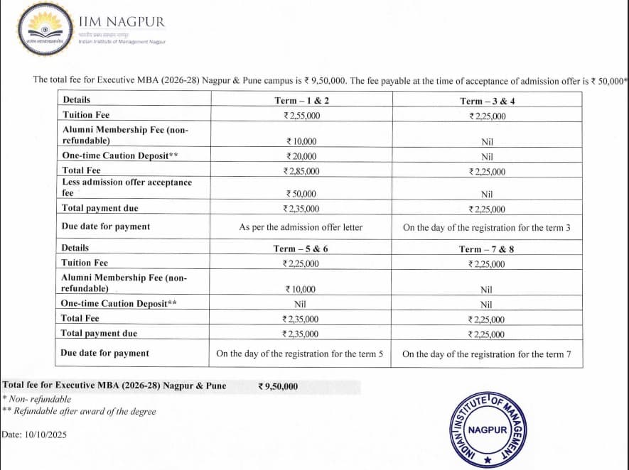 Earlier, EMBA fees at IIM Nagpur was ₹ 9.7 Lakhs (in 2025) for the entire course duration. This shows that the fee has remained unchanged since 2025.