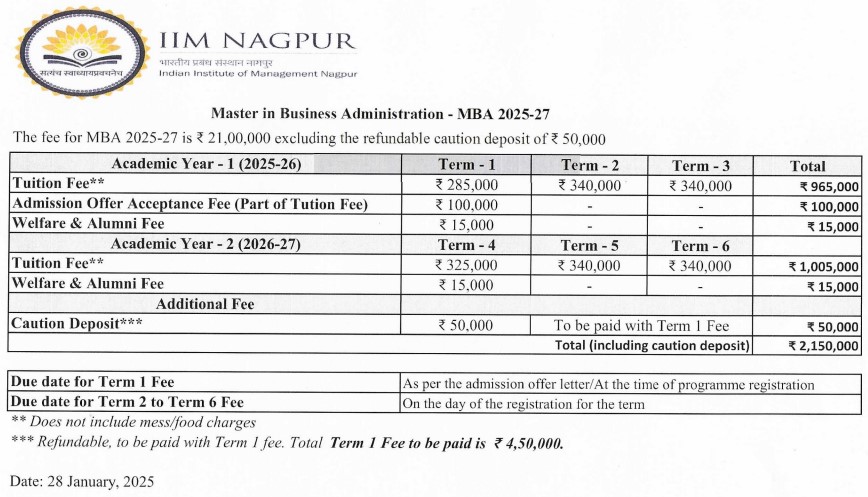 Earlier, MBA fees at IIM Nagpur was ₹ 18.9 Lakhs (in 2024) for the entire course duration. This shows a fee increase of ₹ 2.6 Lakhs over the year.