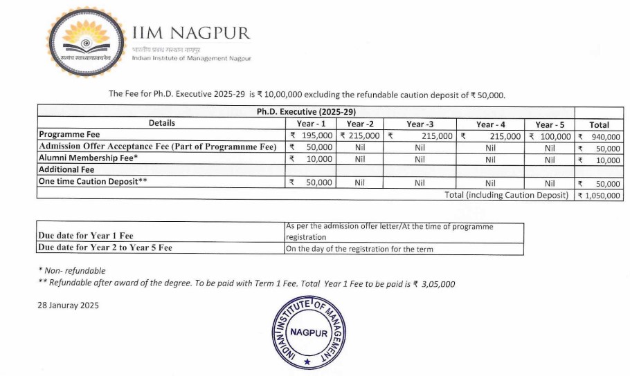 Earlier, Ph.D (Exec.) fees at IIM Nagpur was ₹ 6.5 Lakhs (in 2024) for the entire course duration. This shows a fee increase of ₹ 4 Lakhs over the year.