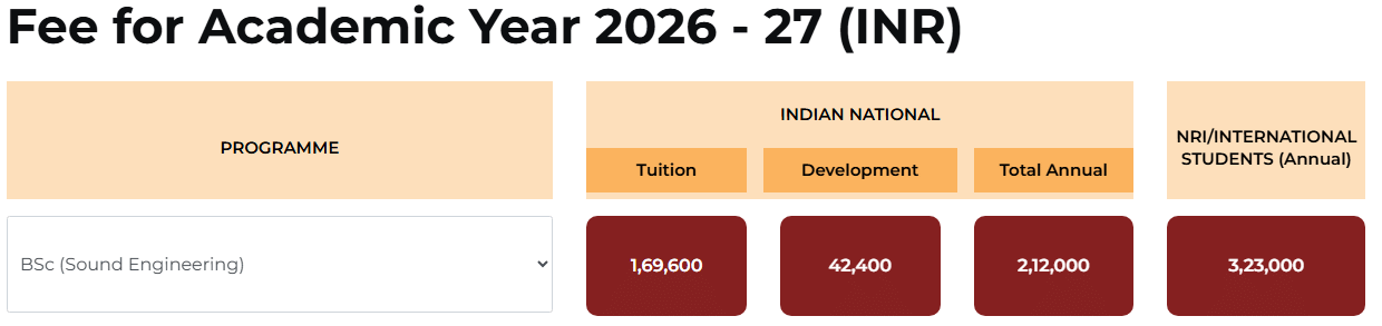 Earlier, B.Sc Sound Engineering fees at NCU was ₹ 6.34 Lakhs (in 2025) for the entire course duration. This shows a fee increase of ₹ 14,840 over the year.