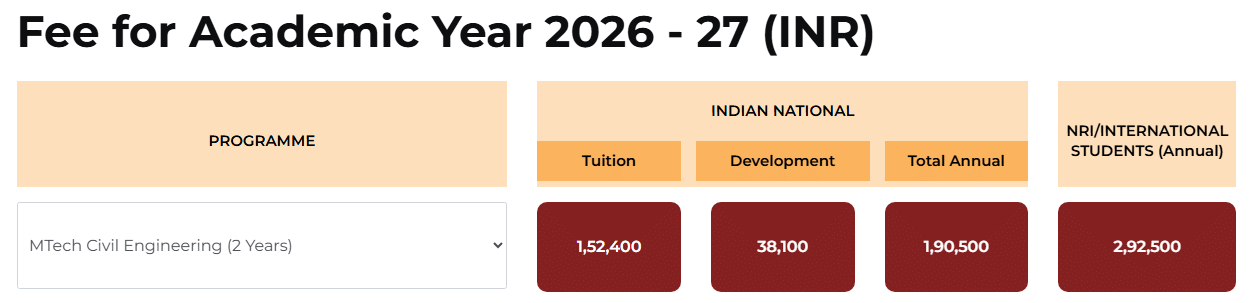 - The total fees for M.Tech Civil Engineering is ₹ 3.92 Lakhs.