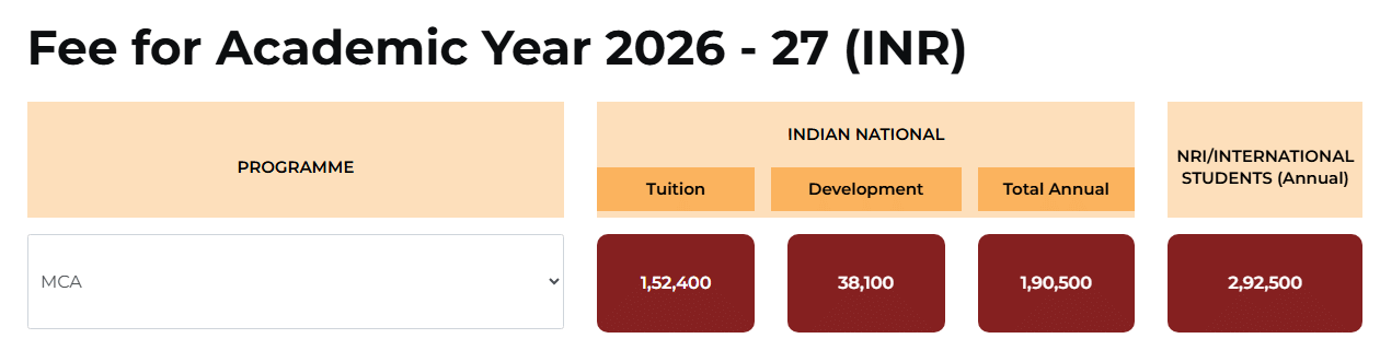 The annual tuition fee is Rs 1,44,000, with an additional development fee of Rs 36,000, a first-semester fee of Rs 90,000, a one-time fee of Rs 12,580, and a registration fee of Rs 1,700. A 30% scholarship is available for CUET-PG scores of 200 or NIMCET ranks up to 600.