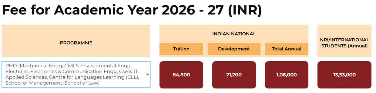 Earlier, Ph.D Applied Sciences fees at NCU was ₹ 3.25 Lakhs (in 2025) for the entire course duration. This shows a fee increase of ₹ 4,340 over the year.