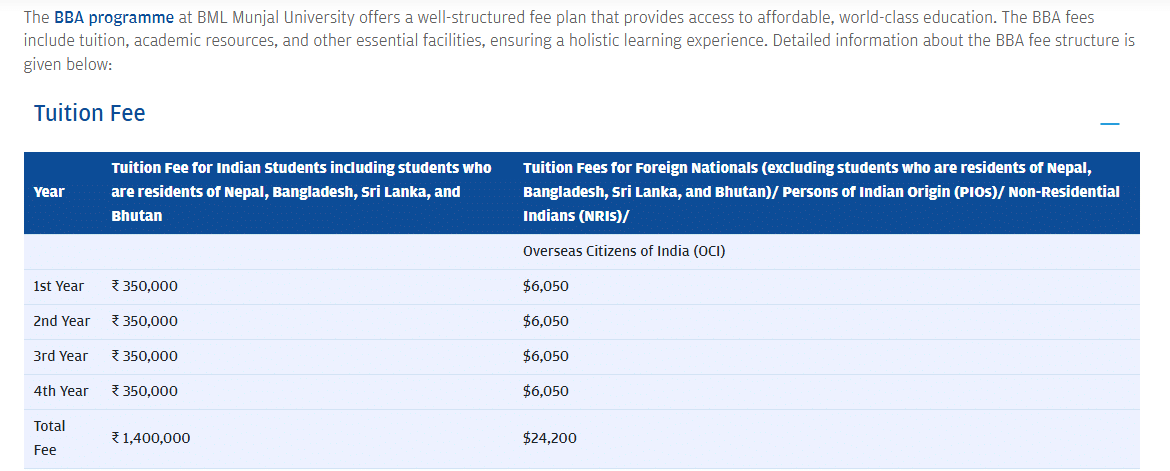 16 Dec, 2025 BMU has released the Fee Structure 2026 for BBA {Hons.} programs. The total academic fee is ₹ 14.6 Lakhs.