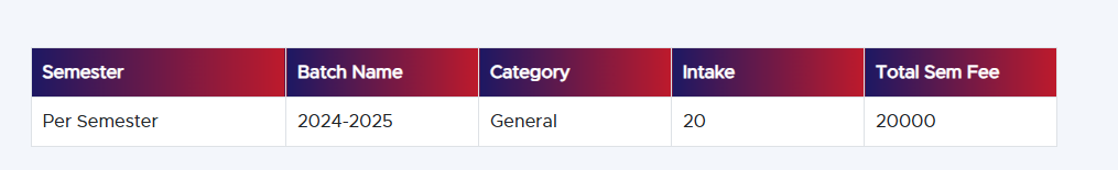 | Semester Wise Fees | ₹20000 | ₹20000 | ₹20000 | ₹20000 |