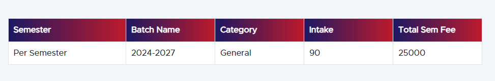 | Semester Wise Fees | ₹25000 | ₹25000 | ₹25000 | ₹25000 | ₹25000 | ₹25000 |