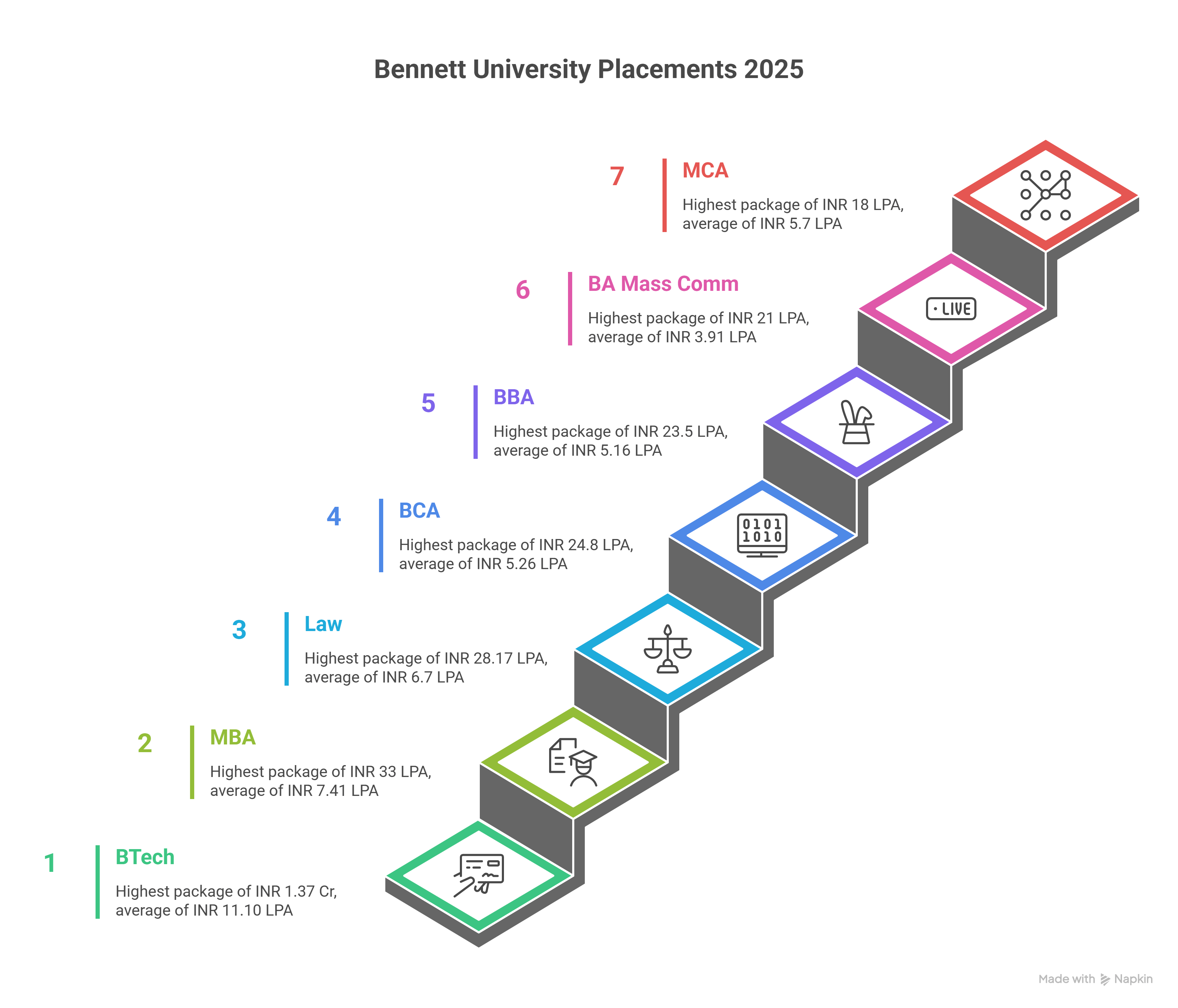 Bennett University Placement 2025 report has not been released yet. As per the latest data available on the official website, Bennett University highest package for the BTech program was INR 1.37 Cr, while Bennett University average package stood at INR 11.10 LPA. For the MBA program, Bennett University’s highest package offered was INR 8 LPA while the average package stood at INR 6.05 LPA. The top recruiters included Microsoft, Google, Dell, Meta, Infosys, KPMG, Deloitte, NDTV, TV9, PVR, Anant Law to name a few. All details regarding the Bennett University Placements are provided in the table below.