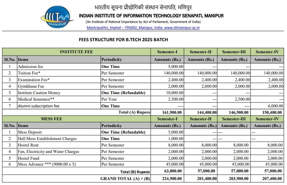 Earlier, B.Tech Artificial Intelligence & Data Science fees at IIIT Manipur was ₹ 9.52 Lakhs (in 2024) for the entire course duration. This shows a fee increase of ₹ 2.4 Lakhs over the year.