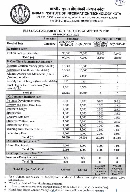 - IIIT Kota Hostel Fee is ₹ 38,000.