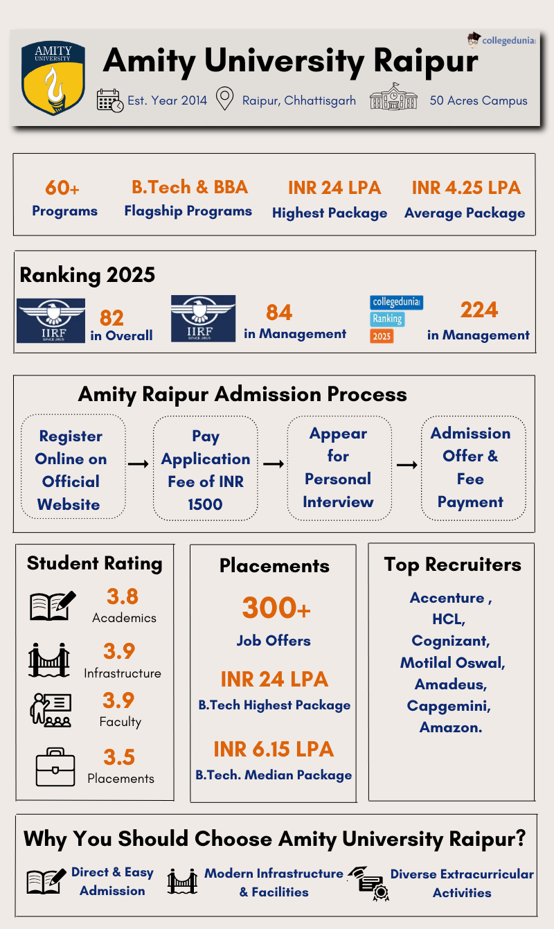 Amity University Raipur is a private university established in 2014 in Chhattisgarh as one of the campuses of the Amity Group in India. It has been ranked 84th by IIRF under the management category in 2025 and 59th by India Today under the overall category in 2024.
