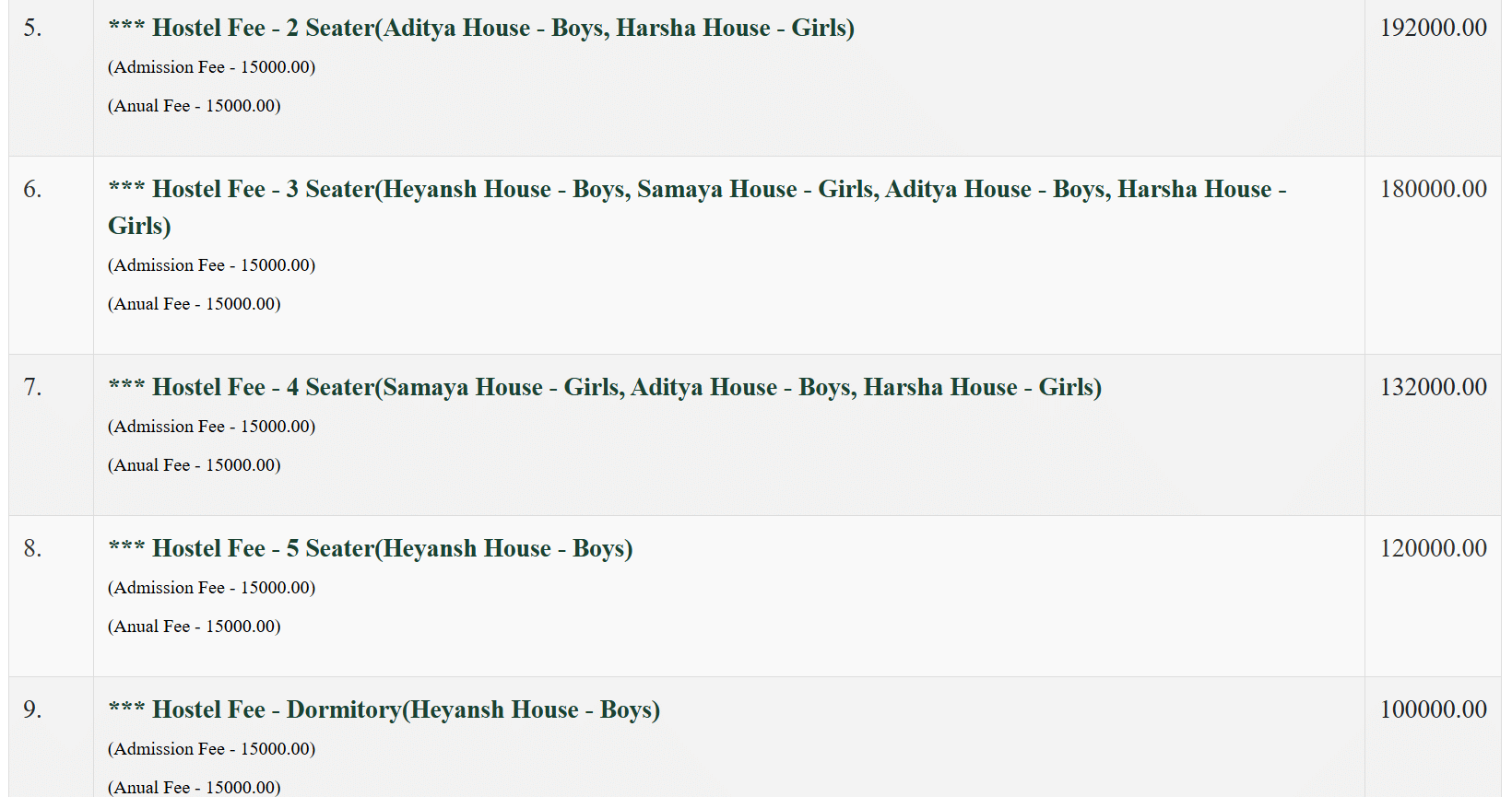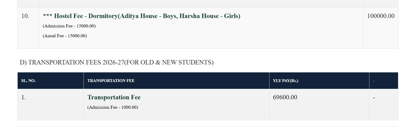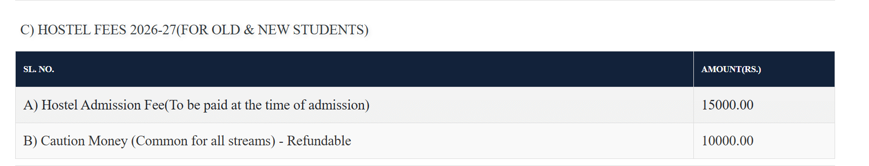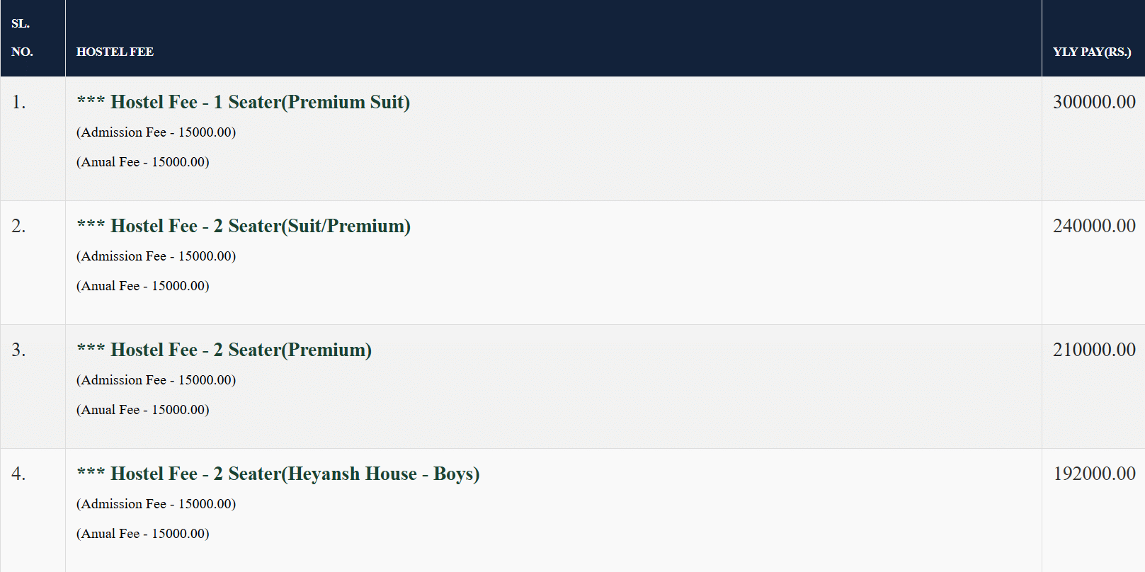 The hostel provides separate accommodations for boys and girls with options of 2, 3, and 4-seater rooms. All rooms are equipped with basic amenities like air conditioning, Wi-Fi, attached bathrooms, and furniture such as tables, chairs, and wardrobes. The hostel fee ranges from 1.40 to 3 lakh INR with an admission fee of 40,000 INR. The facility is centrally air-conditioned with regular cleaning services ensuring hygiene. The campus is strictly vegetarian, though non-vegetarian options are available outside.