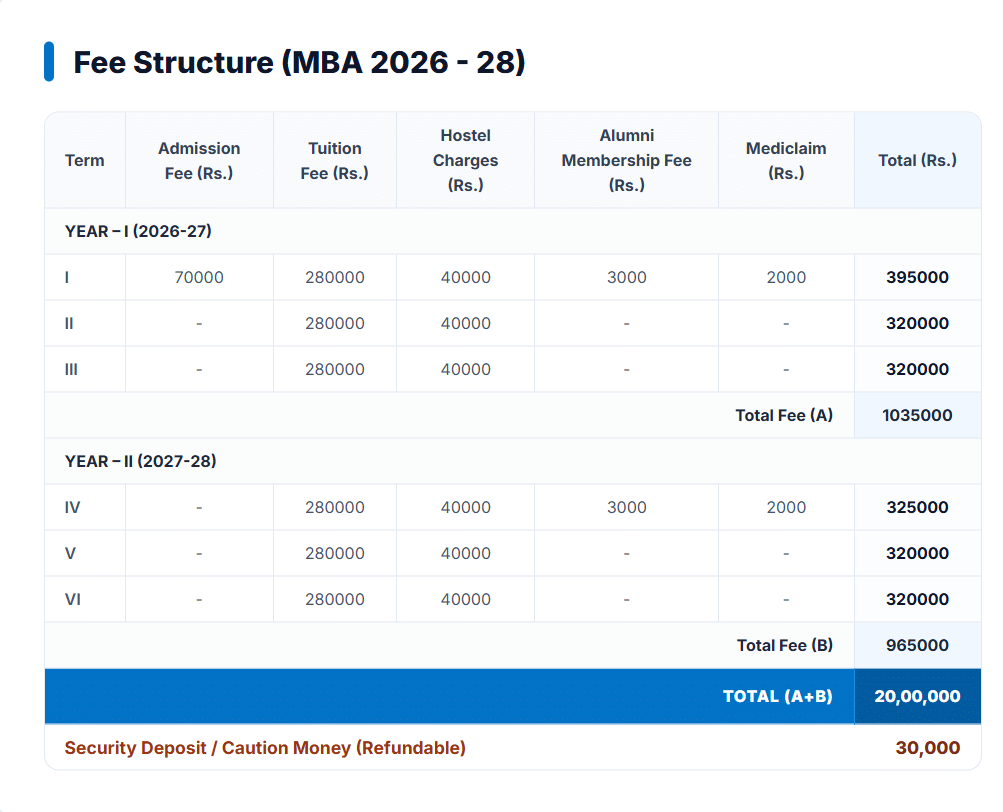 - The total fees for MBA is ₹ 20.3 Lakhs.