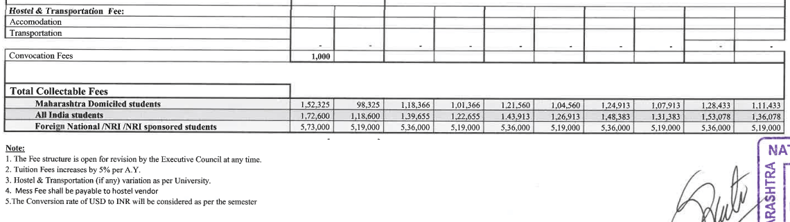 Earlier, BALLB {Hons.} fees at MNLU Mumbai was ₹ 12.12 Lakhs (in 2025) for the entire course duration. This shows a fee increase of ₹ 1.81 Lakhs over the year.