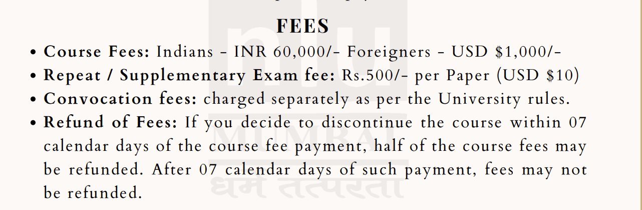 Earlier, PG Diploma Meditation fees at MNLU Mumbai was ₹ 60,000 (in 2024) for the entire course duration. This shows a fee increase of ₹ 5.4 Lakhs over the year.