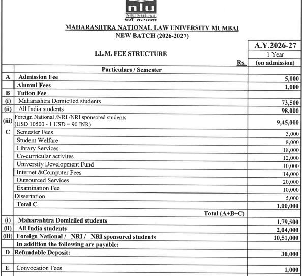 Earlier, L.L.M fees at MNLU Mumbai was ₹ 1.54 Lakhs (in 2025) for the entire course duration. This shows a fee increase of ₹ 81,498 over the year.
