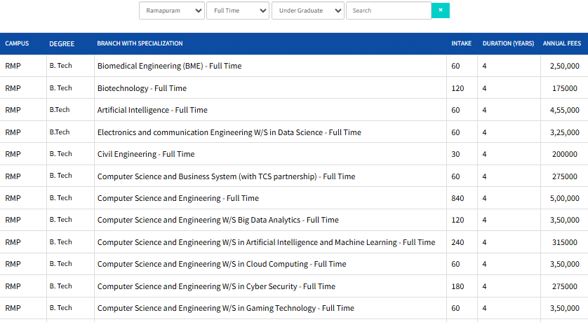 | College | B.Tech Artificial Intelligence & Machine Learning Total Fees |