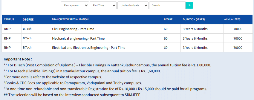 Earlier, B.Tech Mechanical Engineering fees at SRM University Ramapuram was ₹ 2.55 Lakhs (in 2024) for the entire course duration. This shows that the fee has remained unchanged since 2024.