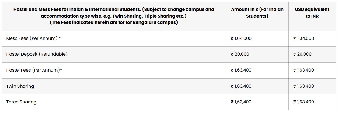 The hostel facilities include separate on-campus accommodations for boys and girls, with fees of INR 60,000 per year up to INR 4.5 lakh per semester, covering all expenses. Rooms are spacious, well-ventilated, and available on twin and triple sharing bases. Amenities include Wi-Fi, LAN, lift access, and regular cleaning services.