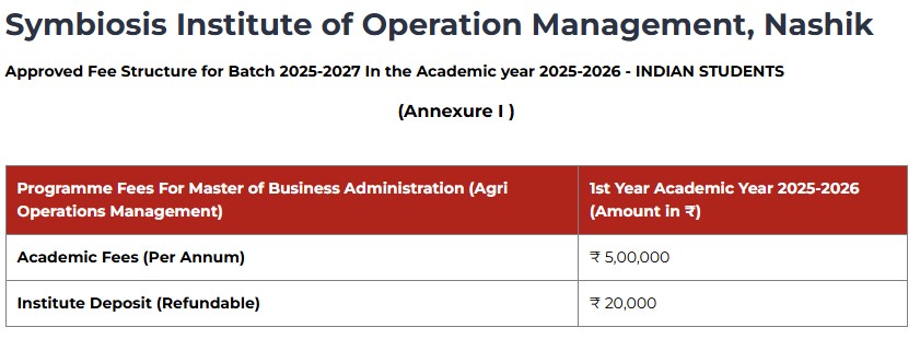 Earlier, MBA Agri Operations Management fees at Symbiosis International University Nashik was ₹ 10.2 Lakhs (in 2025) for the entire course duration. This shows a fee increase of ₹ 50,000 over the year.