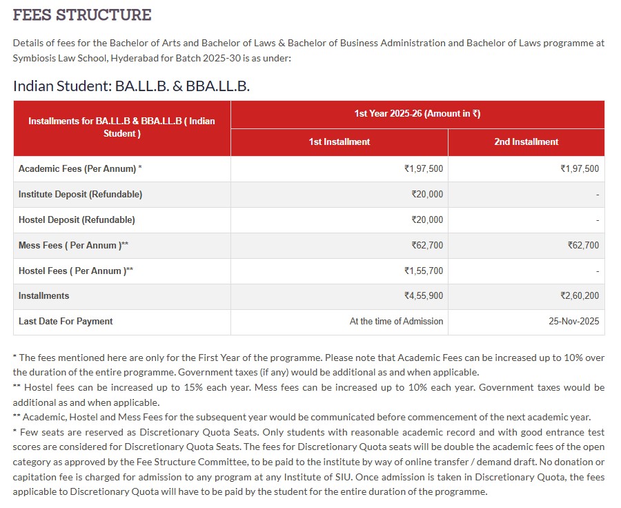 Earlier, BA + L.L.B fees at Symbiosis International University Hyderabad was ₹ 19.35 Lakhs (in 2024) for the entire course duration. This shows a fee increase of ₹ 60,000 over the year.