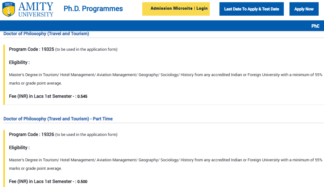 Comparing the course fees at these colleges, the total course fee at Amity University Noida is the highest with ₹ 4.7 Lakhs. This is followed by Amity University Kolkata with ₹ 3 Lakhs Among these, Amity University Kolkata has the lowest fee for Ph.D Tourism Management with ₹ 3 Lakhs.