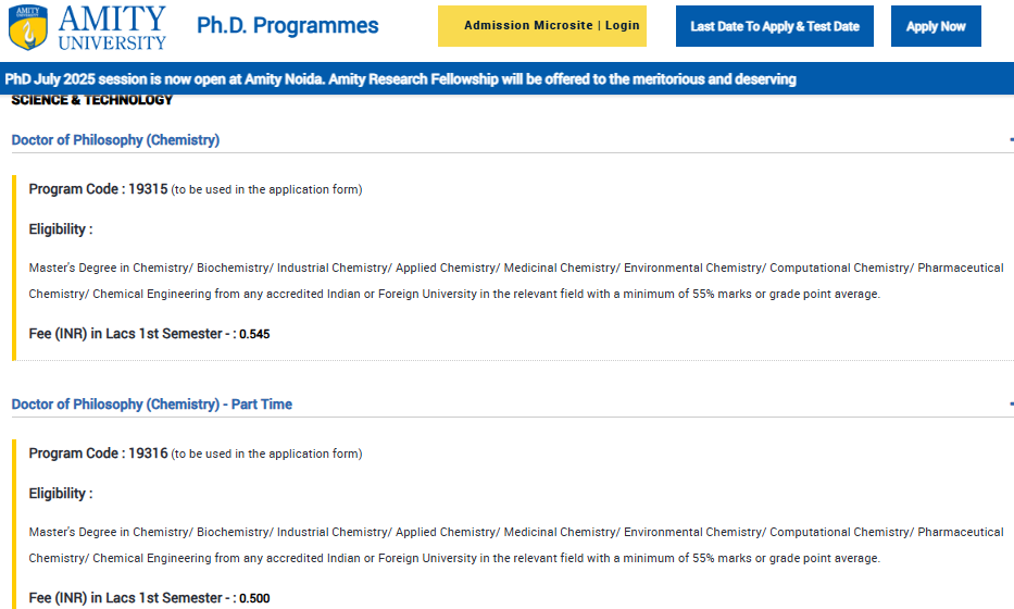 Earlier, Ph.D Chemistry fees at Amity University Kolkata was ₹ 3.09 Lakhs (in 2024) for the entire course duration. This shows a fee increase of ₹ 18,000 over the year.