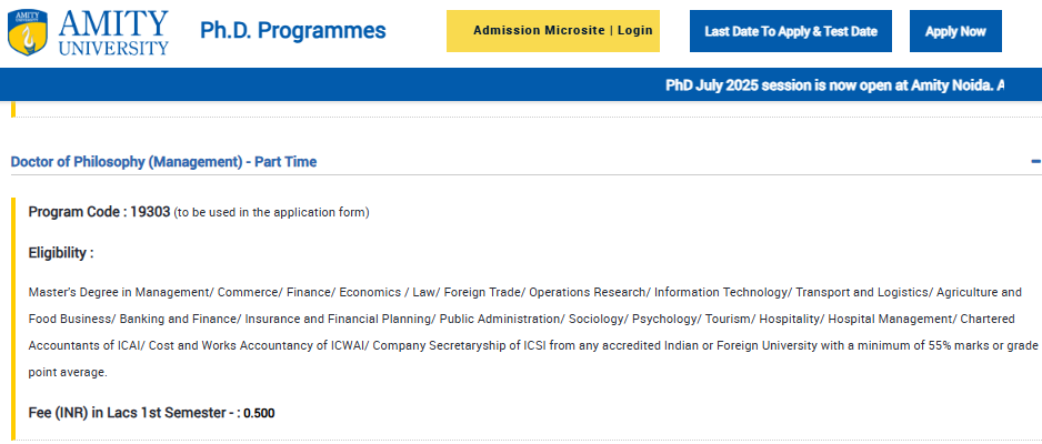 Earlier, Ph.D Management fees at Amity University Kolkata was ₹ 1.44 Lakhs (in 2024) for the entire course duration. This shows a fee increase of ₹ 1.56 Lakhs over the year.