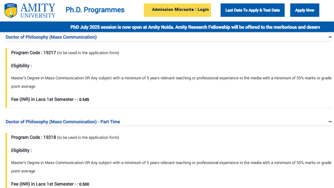 Earlier, Ph.D Mass Communication fees at Amity University Kolkata was ₹ 3.09 Lakhs (in 2024) for the entire course duration. This shows a fee increase of ₹ 18,000 over the year.
