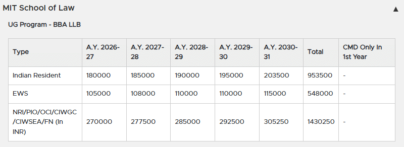 Earlier, BBA + LLB fees at MITADT was ₹ 7.5 Lakhs (in 2025) for the entire course duration. This shows a fee increase of ₹ 7.41 Lakhs over the year.