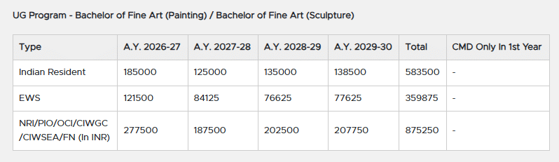 Earlier, B.F.A Painting fees at MITADT was ₹ 7.64 Lakhs (in 2025) for the entire course duration. This shows a fee increase of ₹ 2.5 Lakhs over the year.