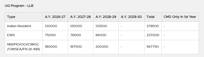Earlier, L.L.B fees at MITADT was ₹ 3.79 Lakhs (in 2025) for the entire course duration. This shows a fee increase of ₹ 3.23 Lakhs over the year.
