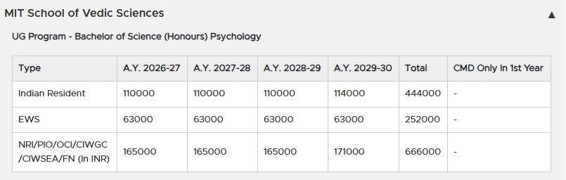 Earlier, B.Sc {Hons.} Psychology fees at MITADT was ₹ 4.12 Lakhs (in 2025) for the entire course duration. This shows a fee increase of ₹ 4.63 Lakhs over the year.