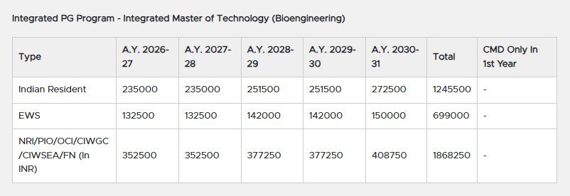 Earlier, B.Tech + M.Tech Bioengineering fees at MITADT was ₹ 12.46 Lakhs (in 2025) for the entire course duration. This shows a fee increase of ₹ 5.38 Lakhs over the year.