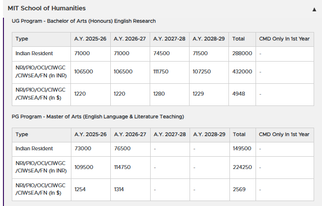 MITADT BA {Hons.} English is offered as 3 Years Full Time program, with total intake of 13 seats. The minimum eligibility criteria for BA {Hons.} is 10+2 with 50%. The total fees for MITADT BA {Hons.} English in 2025 is ₹ 2.88 Lakhs for the complete course duration, which includes total tuition fees of ₹ 2.88 Lakhs. Earlier, the fees in 2024 - 2025 for BA {Hons.} English was ₹ 2.17 Lakhs.