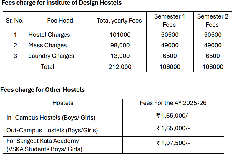 The college offers extensive hostel facilities, accommodating most students with a variety of options both on and off-campus. The hostel fee ranges from Rs. 1,25,000 to Rs. 2,15,000 per year depending on room sharing preferences, with double and triple-sharing rooms available. Facilities include Wi-Fi, 24/7 electricity, hot water, and daily room cleaning.