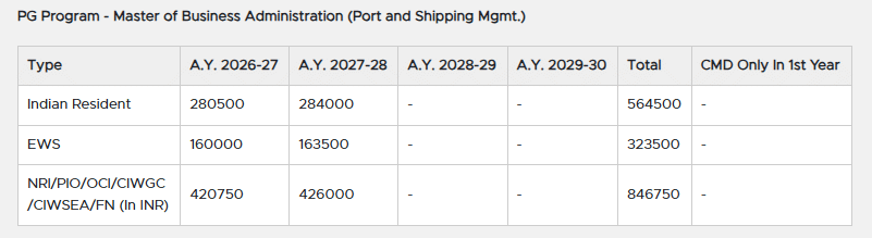 Earlier, MBA Port & Shipping Management fees at MITADT was ₹ 4.14 Lakhs (in 2025) for the entire course duration. This shows a fee increase of ₹ 3.66 Lakhs over the year.