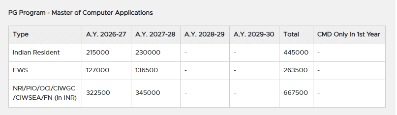 Earlier, MCA fees at MITADT was ₹ 4.05 Lakhs (in 2025) for the entire course duration. This shows a fee increase of ₹ 2.55 Lakhs over the year.