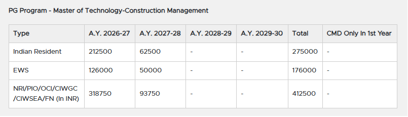 Earlier, M.Tech Construction Management fees at MITADT was ₹ 3.51 Lakhs (in 2025) for the entire course duration. This shows a fee increase of ₹ 1.4 Lakhs over the year.