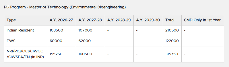 Earlier, M.Tech Environmental Engineering fees at MITADT was ₹ 2.11 Lakhs (in 2025) for the entire course duration. This shows a fee increase of ₹ 2.15 Lakhs over the year.
