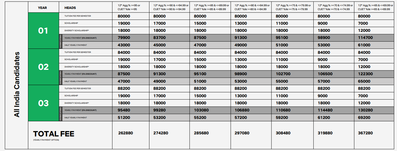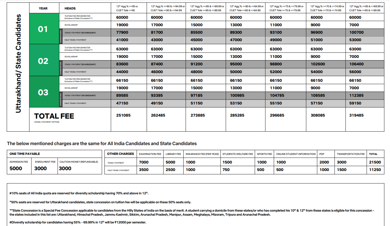 BBA graduates typically earn an annual package starting at INR 5,00,000, with an average between INR 7,00,000 and INR 8,00,000. Internship opportunities are available for advanced students, enhancing practical skills. The university offers scholarships that can significantly reduce the annual fee of over INR 1.50 lakh, with special benefits for Uttarakhand residents and high-performing students. The fee structure includes specific charges for various facilities, such as examination fees (INR 7,000), library fees (INR 5,000), and more, totaling INR 63,205.