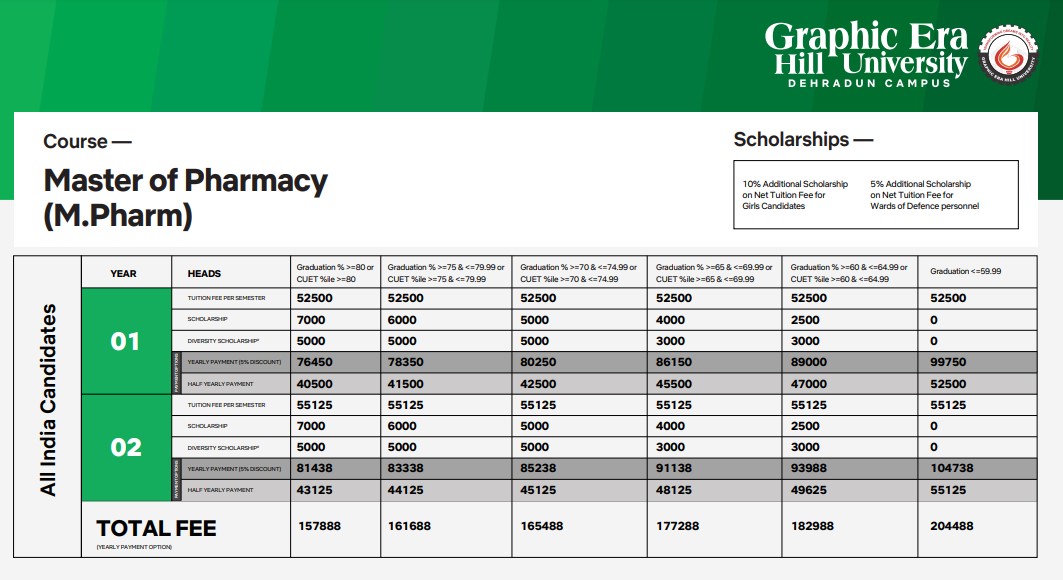 M.Pharm Pharmaceutics Fees at GEHU Dehradun covers a range of expenses, including tuition fee, course materials, and access to campus facilities.