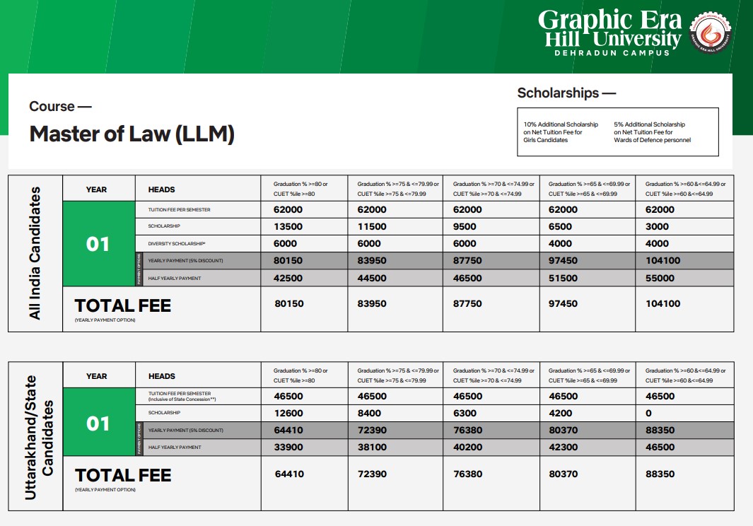 L.L.M Fees at GEHU Dehradun covers a range of expenses, including tuition fee, course materials, and access to campus facilities.