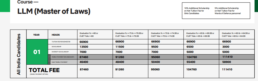 Earlier, L.L.M fees at GEHU Dehradun was ₹ 1.7 Lakhs (in 2025) for the entire course duration. This shows that the fee has remained unchanged since 2025.