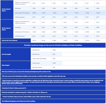 The college offers a reasonable tuition fee structure of about Rs. 3,00,000, which can be paid per semester or annually through multiple platforms. Scholarships are plentiful, targeting high-achieving students with over 90% marks and those from lower middle-class families. Uttarakhand residents benefit from a 25% scholarship, while students from defense backgrounds get a 5% discount.
