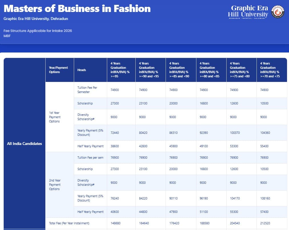 Earlier, MBA Fashion Management fees at GEHU Dehradun was ₹ 8.42 Lakhs (in 2025) for the entire course duration. This shows that the fee has remained unchanged since 2025.