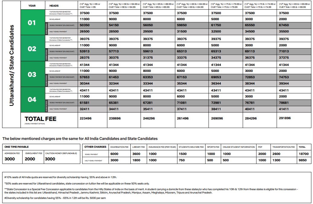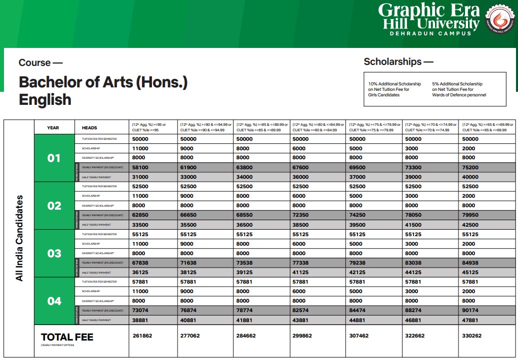 English Honours tuition is approximately 50,000 INR per semester, with a 5% scholarship for female students, bringing the total cost to roughly 3,00,000 INR. A 10% scholarship for Uttarakhand residents and merit-based scholarships are also available. Hostel fees vary based on accommodation type and amenities. The employment rate for graduates is considered satisfactory.