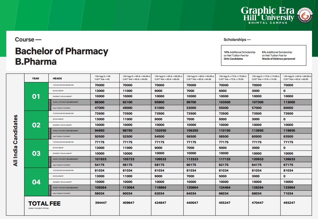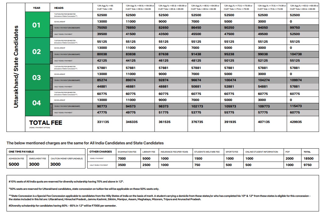 Additional scholarships offer up to a 25% discount for students from the Himalayan region. The university also provides financial support and study loans for low-income families. The fee covers tuition, library, examination, insurance, and other charges. GEHU offers opportunities through its Entrepreneurial Incubator and Study Abroad Program.
