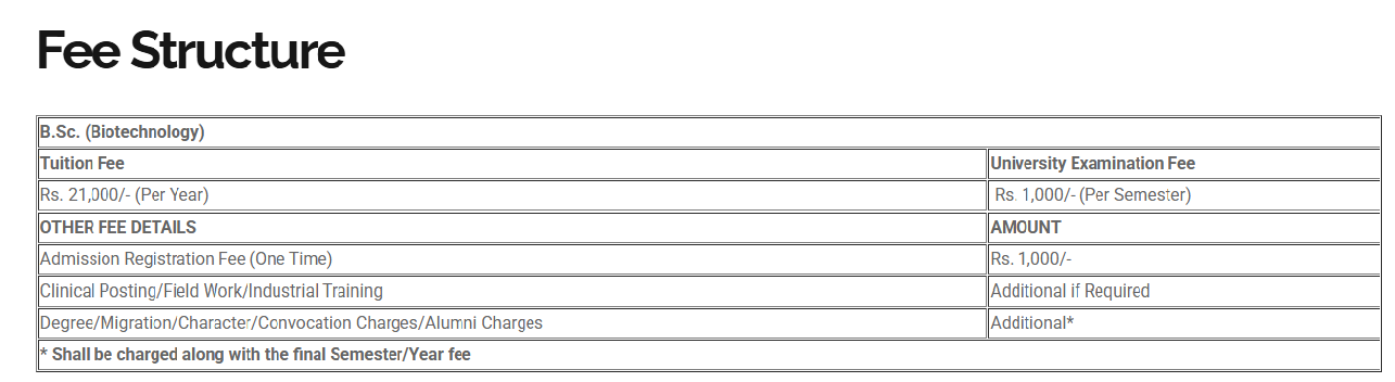 Glocal University Saharanpur B.Sc {Hons.} Biotechnology fees in first year is ₹ 24,000. The detailed fees is mentioned below.