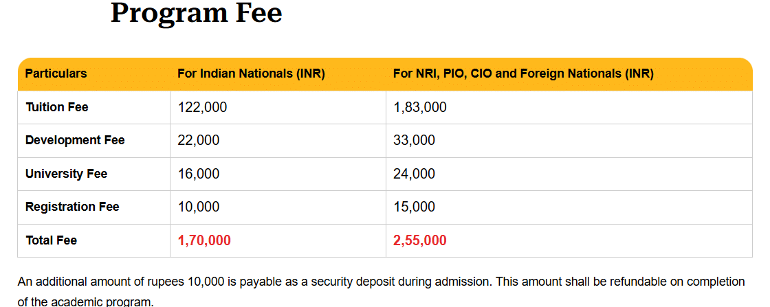 | Fees (2025 - 2026) | Year 1 (in INR) | Year 2 (in INR) | Year 3 (in INR) | Year 4 (in INR) | Year 5 (in INR) |