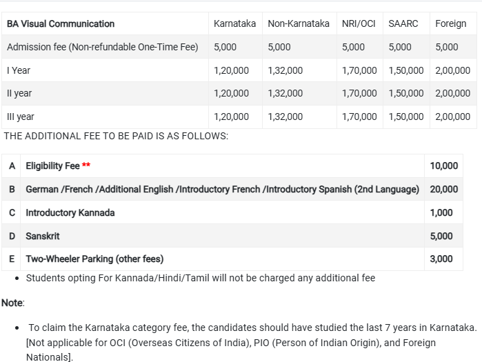 Some courses cost 70,000 INR per year, while Science courses are under 50,000 INR annually. The Visual Communication program totals approximately 4 lakhs INR, with annual fees of 1,15,000 INR, slightly varying for Karnataka residents and NRIs. The college actively participates in placement activities, benefiting mainly Arts and Commerce students, with about 80% securing placements by the final semester. Although there is no direct internship program, students can pursue internships with faculty approval.